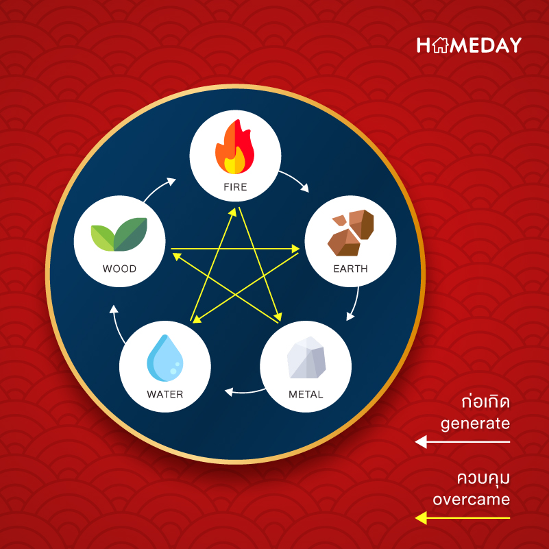 แต่เรื่องราวของโหราศาสตร์จีนยังไม่จบเพียงเท่านี้ ยังมีเรื่องของเบญจธาตุเข้ามาเกี่ยวพันอยู่อีกด้วย ซึ่งจะมีธาตุประกอบด้วย ธาตุดิน ธาตุทอง ธาตุน้ำ ธาตุไม้ และ ธาตุไฟ ซึ่งธาตุนั้นจะมีทั้งส่งเสริมและพิฆาตกันตามหลักดังนี้