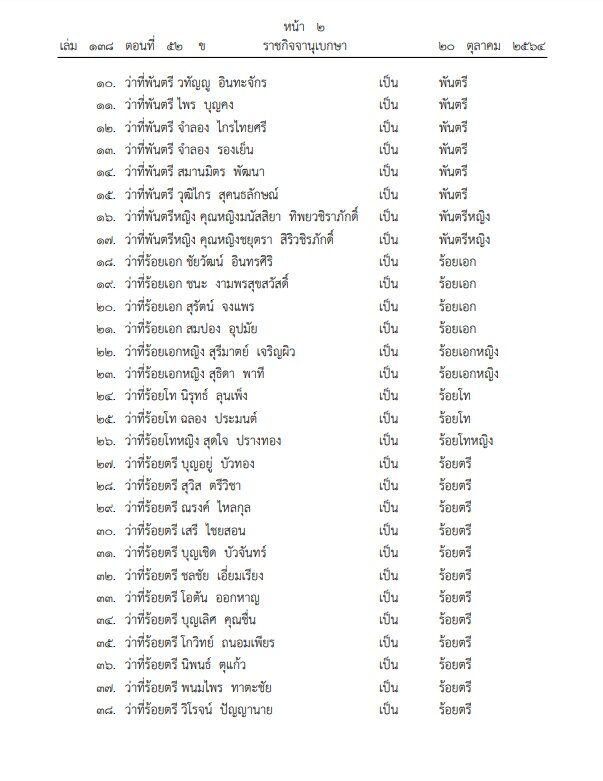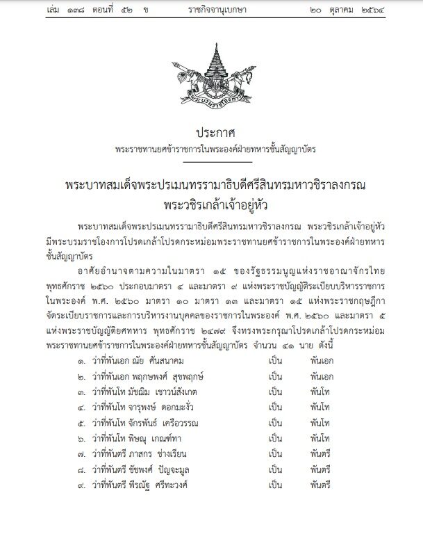 เมื่อวันที่ 20 ต.ค.64 เว็บไซต์ราชกิจจานุเบกษา เผยแพร่ประกาศพระราชทานยศข้าราชการในพระองค์ฝ่ายทหารชั้นสัญญาบัตร พระบาทสมเด็จพระปรเมนทรรามาธิบดีศรีสินทรมหาวชิราลงกรณ พระวชิรเกล้าเจ้าอยู่หัว มีพระบรมราชโองการโปรดเกล้าโปรดกระหม่อมพระราชทานยศข้าราชการในพระองค์ฝ่ายทหาร ชั้นสัญญาบัตร