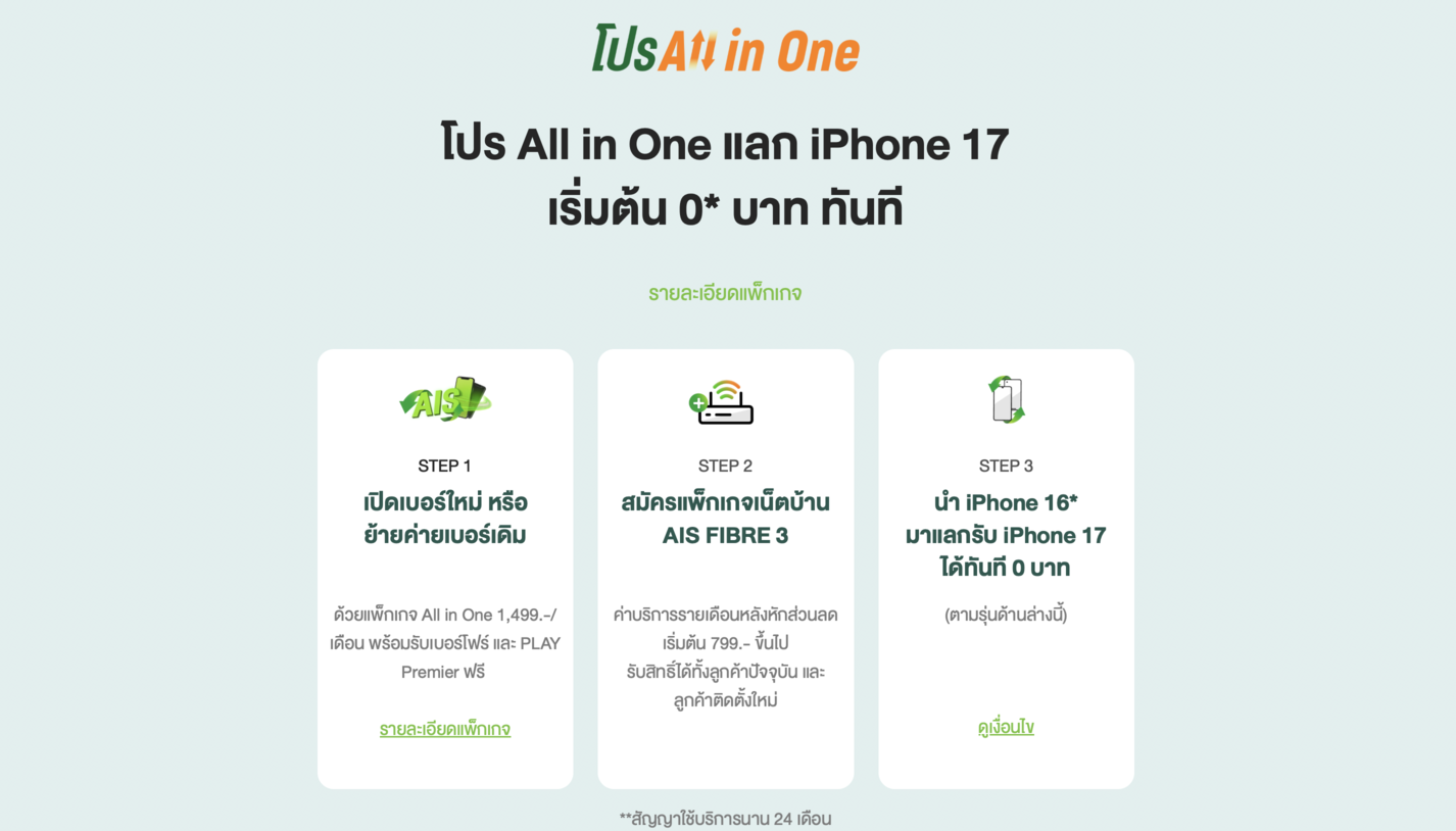 ในเมื่อฝั่ง True - Dtac ให้โปรข้ามเวลา ดังนั้น AIS ขออยู่กับปัจจุบันด้วยโปรฯ All in One แลก iPhone 17 เริ่มต้น 0 บาท โดยมี 3 เงื่อนไข เช่นกัน