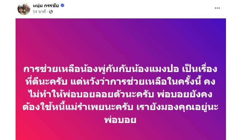 ล่าสุด หนุ่ม กรรชัย ออกมาโพสต์เฟซบุ๊กส่วนตัว ระบุว่า "การช่วยเหลือน้องพู่กันกับน้องแมงปอ เป็นเรื่องที่ดีนะครับ แต่หวังว่าการช่วยเหลือในครั้งนี้ คงไม่ทำให้พ่อบอยลอยตัวนะครับ พ่อบอยยังคงต้องใช้หนี้แม่รำเพยนะครับ เรายังมองคุณอยู่นะพ่อบอย"