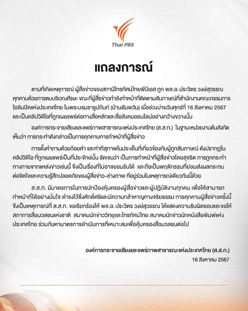 โดยระบุว่า ตามที่เกิดเหตุการณ์ ผู้สื่อข่าวของสถานีโทรทัศน์ไทยพีบีเอส ถูก พล.อ.ประวิตร วงษ์สุวรรณ คุกคามด้วยการตบบริเวณศีรษะ ขณะที่ผู้สื่อข่าวกำลังทำหน้าที่ติดตามสัมภาษณ์ ที่สำนักงานคณะกรรมการโอลิมปิคแห่งประเทศไทย ในพระบรมราชูปถัมภ์ (บ้านอัมพวัน) เมื่อช่วงบ่ายวันศุกร์ที่ 16 สิงหาคม 2567 และเป็นคลิปวิดีโอที่ถูกเผยแพร่ต่อทางสื่อหลักและสื่อสังคมออนไลน์อย่างกว้างขวางนั้น