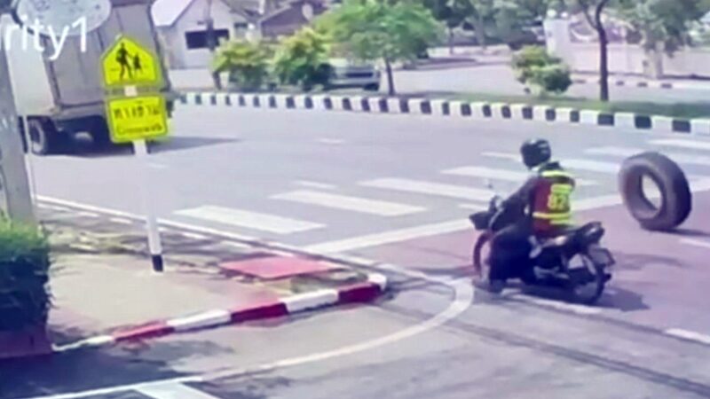 2 นร.หญิงเจ็บ กระเด็นตกรถ ล้อรถบรรทุกหลุดกลิ้งวิ่งชนจยย.วิน วงจรปิดจับภาพชัด
