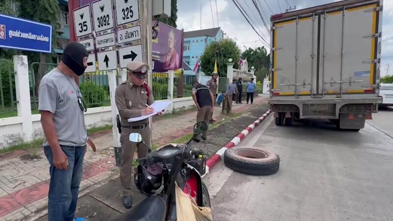 วันที่ 18 ต.ค.2567 ร.ต.อ.นิภัทร กอสกุล รอง สารวัตร(สอบสวน) สภ.เมืองสมุทรสงคราม รับแจ้งอุบัติเหตุ ล้อรถบรรทุก 10 ล้อหลุดกระเด็นกลิ้งไปชนรถจักรยานยนต์มีผู้ได้รับบาดเจ็บ บนถนนเอกชัย หน้าวิทยาลัยสารพัดช่างสมุทรสงคราม ต.ลาดใหญ่ อ.เมือง จ.สมุทรสงคราม จึงไปตรวจสอบพร้อมเจ้าหน้าที่กู้ภัยมูลนิธิสว่างเบญจธรรมสมุทรสงคราม