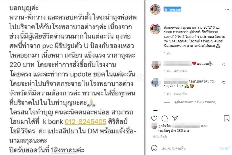 ออกมาช่วยกันคนล่ะนิดคนล่ะหน่อย ล่าสุด น้ำหวาน ซาซ่า พิมรา เจริญภักดี ได้โพสต์ชวนแฟนๆมาทำบุญด้วยการซื้อถุงห่อศพบริจาคให้กับโรงพยาบาล