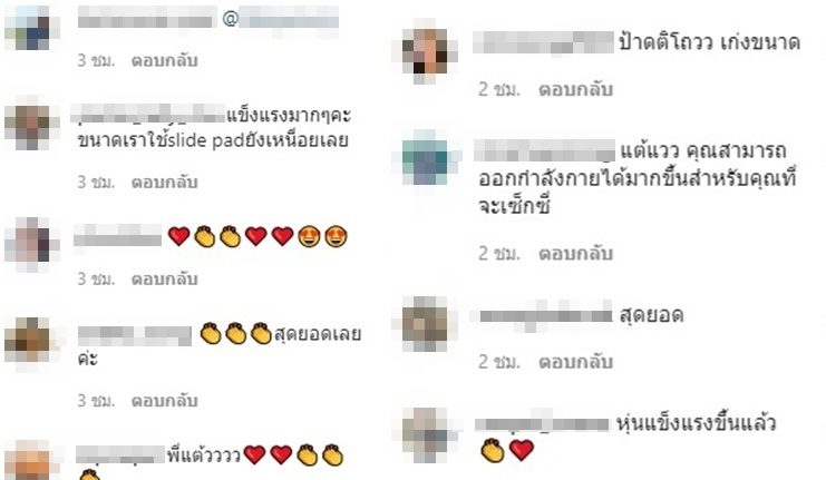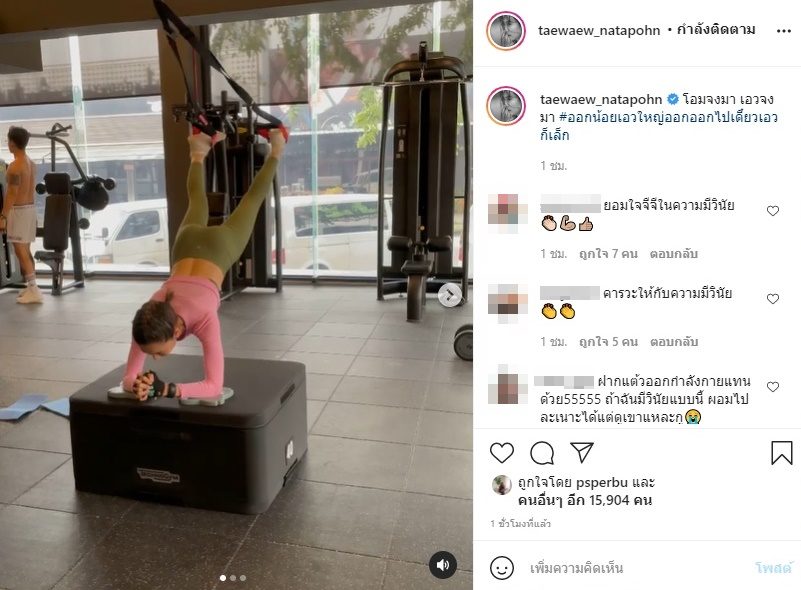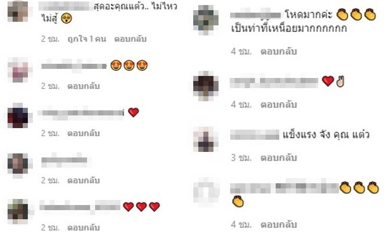 ทำเอาแฟนคลับเข้ามาคอมเมนต์ชมความแข็งแกร่งของร่างกายสาวแต้วจำนวนมาก แถมบอกว่าท่านี้โหดมากๆ คนที่ชอบออกกำลังกายเหมือนกันยังชมความแข็งแรงของแต้วด้วย “โหดมากค่ะ เป็นท่าที่เหนื่อยมากกกกกก” , “แข็งแรงมากๆคะ ขนาดเราใช้slide padยังเหนื่อย” เป็นต้น