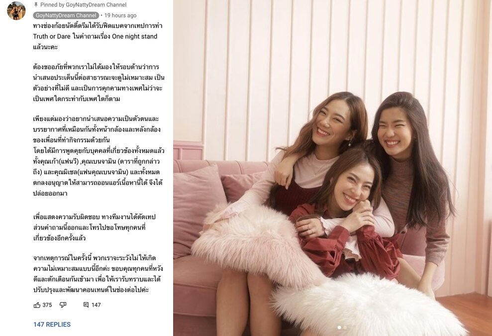 ล่าสุด ก้อย นัตตี้ ดรีม ได้ขอโทษผ่านช่องยูทูบของตัวเองว่า ทางช่องก้อยนัตตี้ดรีมได้รับฟีดแบ็คจากเทปการทำ Truth or Dare ในคำถามเรื่อง One night stand แล้วนะคะต้องขออภัยที่พวกเราไม่ได้มองให้รอบด้านว่าการนำเสนอประเด็นนี้ต่อสาธารณะจะดูไม่เหมาะสม เป็นตัวอย่างที่ไม่ดี และเป็นการคุกคามทางเพศไม่ว่าจะเป็นเพศใดกระทำกับเพศใดก็ตาม