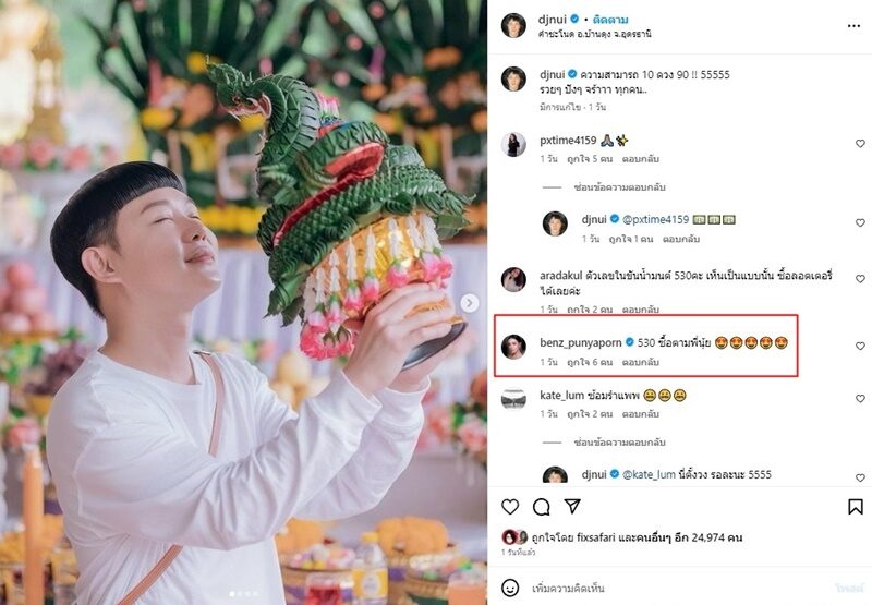 โดยเผยเลขธูป ส่องกันเอาเลย และเลขขันน้ำมนต์ที่เหมือนเลข 3 ตัวจะขึ้นมาชัดๆ ทำเอาสาวเบนซ์ ปุณยาพร เข้ามาคอมเมนต์ด้วยว่า530 ซื้อตามพี่นุ้ย บางคนก็เห็นเป็นเลขดังกล่าวโดยบอกว่าตัวเลขในขันน้ำมนต์ 530 ค่ะ เห็นเป็นแบบนั้น ซื้อลอตเตอรี่ได้เลยค่ะ ขณะที่แฟนๆเข้ามาร่วมอนุโมทนาสาธุด้วยกันรัวๆ