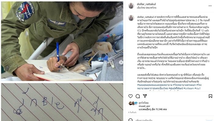 ทั้งนี้เมื่อ 6 วันก่อน เสธ.ดอลลาร์ เผยอาการภรรยาพร้อมภาพข้อความที่ภรรยาเขียนให้ว่า “ภายหลังจากที่อาการดีขึ้นเเละสามารถถอดเครื่องช่วยหายใจออกได้ เเมงมุมก็ได้ย้ายไปอยู่ห้องธรรมดาประมาณ 2-3 วัน ก่อนที่จะมีอาการหายใจไม่สะดวก หอบเหนื่อย ซึ่งเกิดจากมีเสมหะอุดกั้นทางเดินหายใจ มีภาวะปอดแฟบหรือมีการหายใจลำบาก จึงต้องกลับมาอยู่ใน ICU อีกครั้งเเละกลับไปใช้เครื่องช่วยหายใจอีก