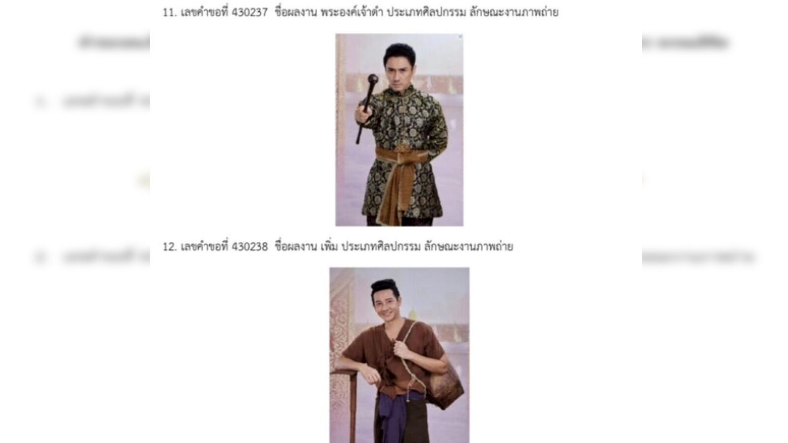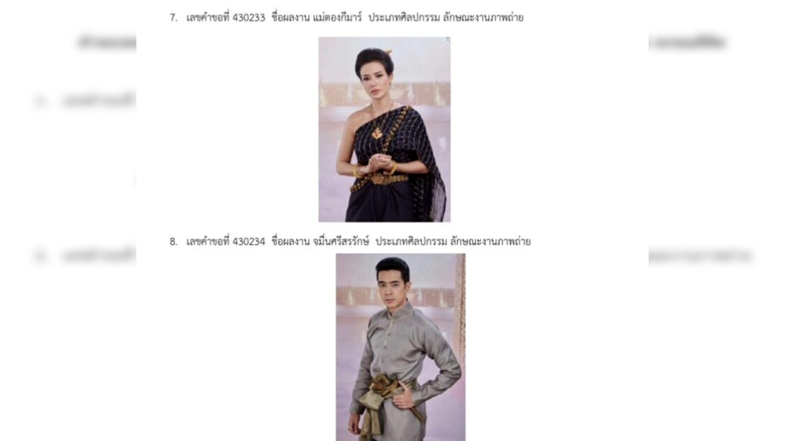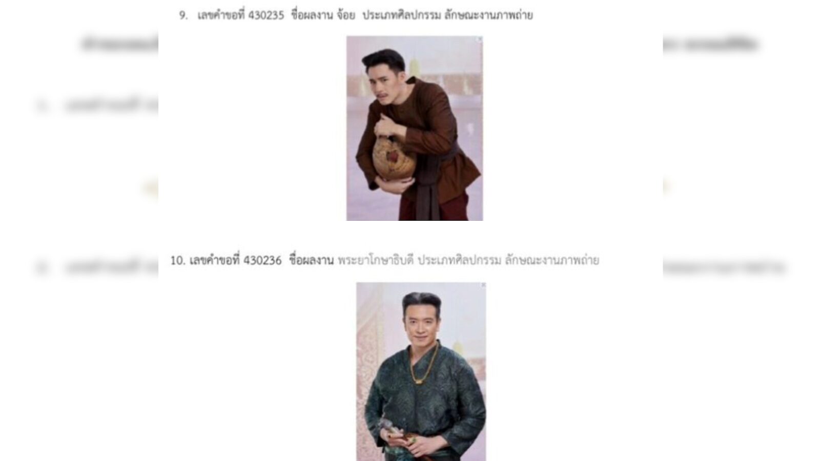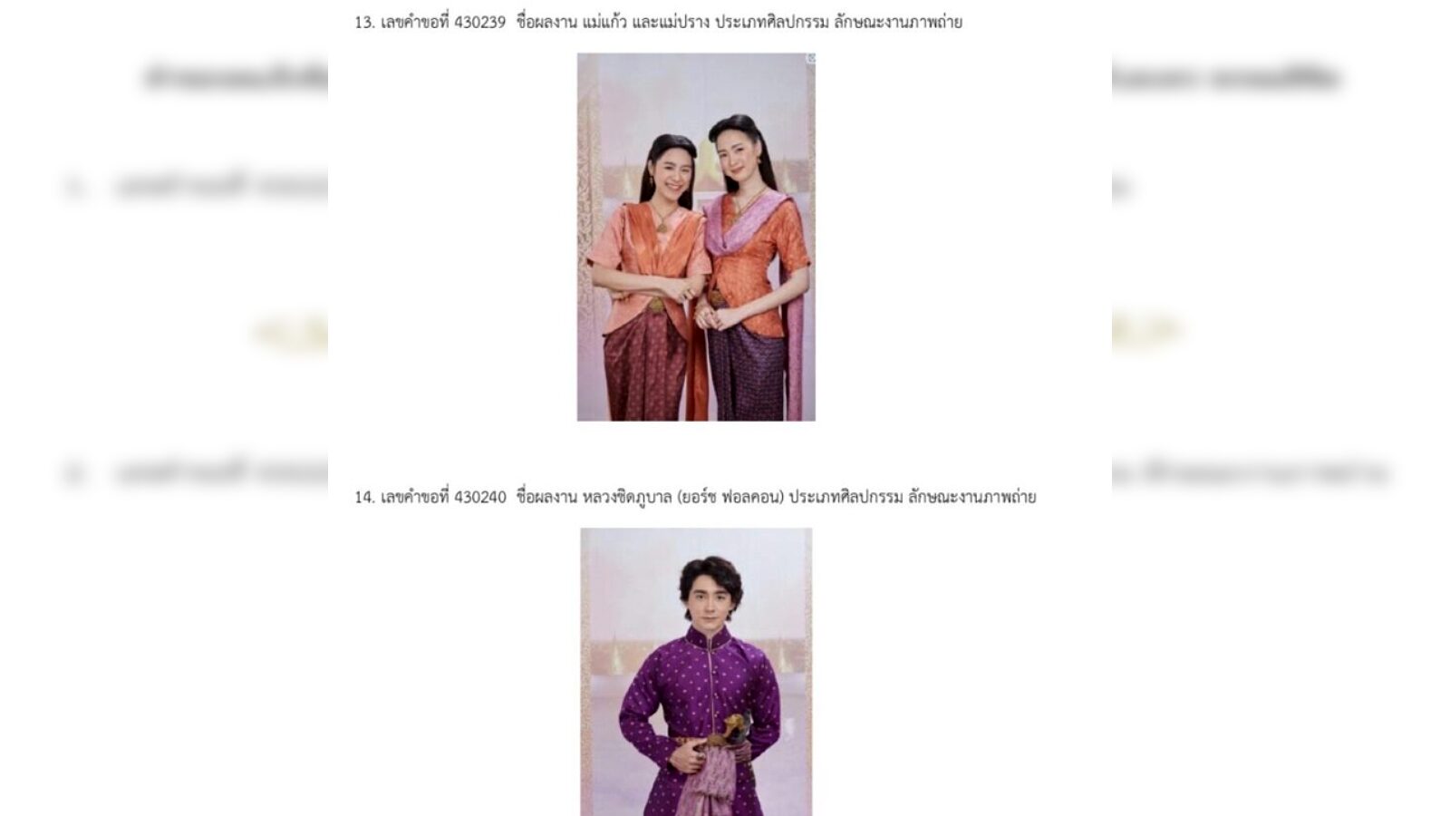 -มี 15 ผลงาน ประเภทศิลปกรรม ลักษณะงานภาพถ่าย ชื่อผลงาน พระยาวิสูตรสาคร และเกศสุรางค์, พุดตาน, พ่อเรือง, พ่อริด, พระนามณรงค์ และจันทร์วาด, แม่ตองกีมาร์, จมื่นศรีสรรักษ์, จ้อย, พระยาโกษาธิบดี, พระองค์เจ้าดํา, เพิ่ม, แม่แก้ว และแม่ปราง, หลวงชิดภูบาล (ยอร์ช ฟอลคอน), หมู่สง และ พระยาวิสูตรสาคร และเกศสุรางค์2