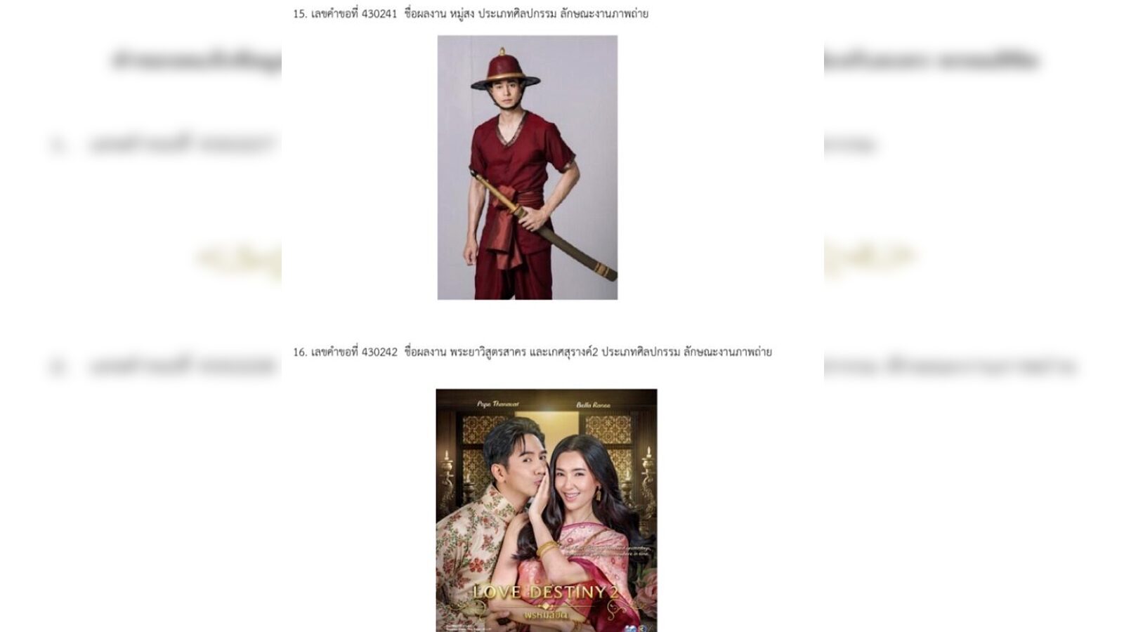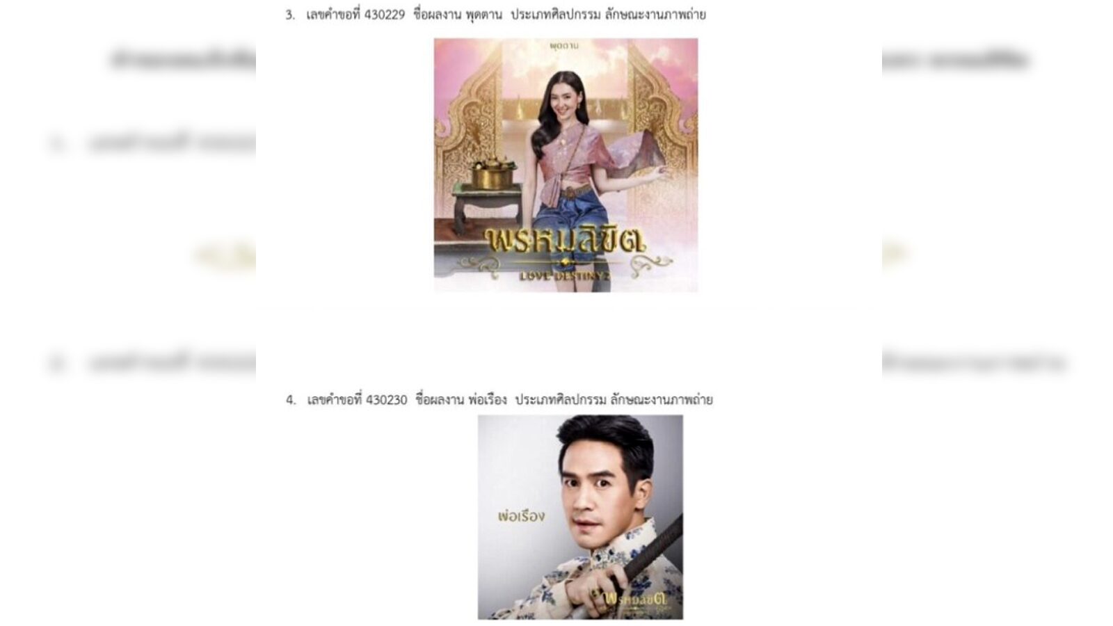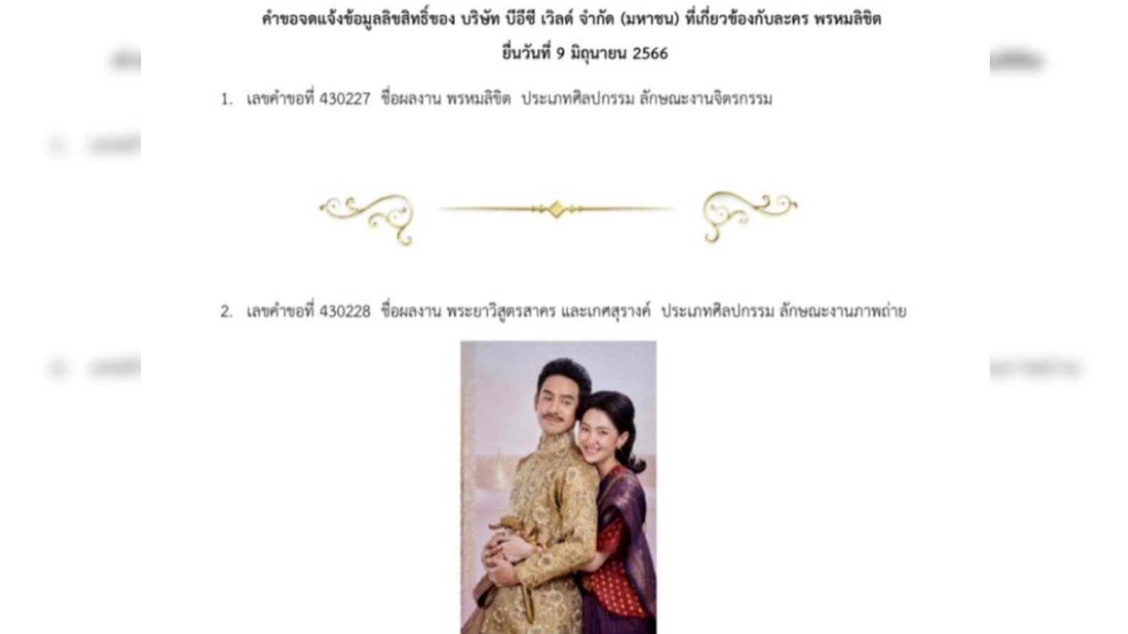 โดยในส่วนของ 16 ผลงานที่กรมทรัพย์สินทางปัญญาได้รับคําขอจดแจ้งข้อมูลลิขสิทธิ์ของ บริษัท บีอีซี เวิลด์ จํากัด (มหาชน) ที่เกี่ยวข้องกับละครพรหมลิขิตยื่นวันที่ 9 มิถุนายน 2566
