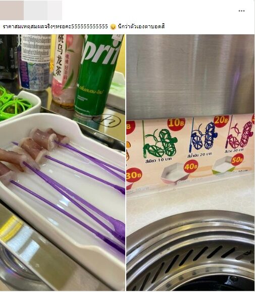 หลังเข้าไปรับประทานอาหาร ที่ร้านสุกี้สายพานสไตล์จีนแห่งหนึ่ง ซึ่งมีน้ำซุปหลากหลายให้เลือก อร่อยกันแบบหม้อส่วนตัว ก่อนจะพบกับความอึ้ง เพราะปลาหมึกที่เสียบด้วยไม้สีม่วง มีราคาชิ้นละ 30 บาทเลยทีเดียว