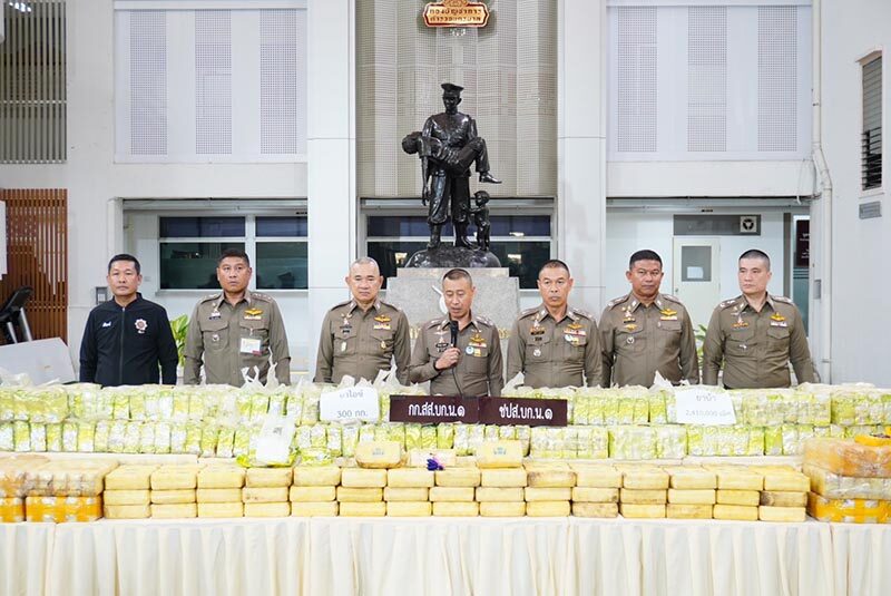 แถลงจับกุมนายจาย หนุ่มแลง อายุ 20 ปี สัญชาติเมียนมา และน.ส.หอม อายุ 20 ปี สัญชาติ เมียนมา พร้อมของกลาง ยาไอซ์ 300 ห่อ น้ำหนักห่อละประมาณ 1 กิโลกรัม รวม 300 กิโลกรัม และยาบ้า จำนวน 2,400,000 เม็ด โทรศัพท์ 2 เครื่อง รถบรรทุก 1 คัน จับกุมได้บริเวณริมถนน นบ.10002 ต.บางรักพัฒนา อ.บางบัวทอง จ.นนทบุรี เมื่อเวลา 01.00 น. ที่ผ่านมา