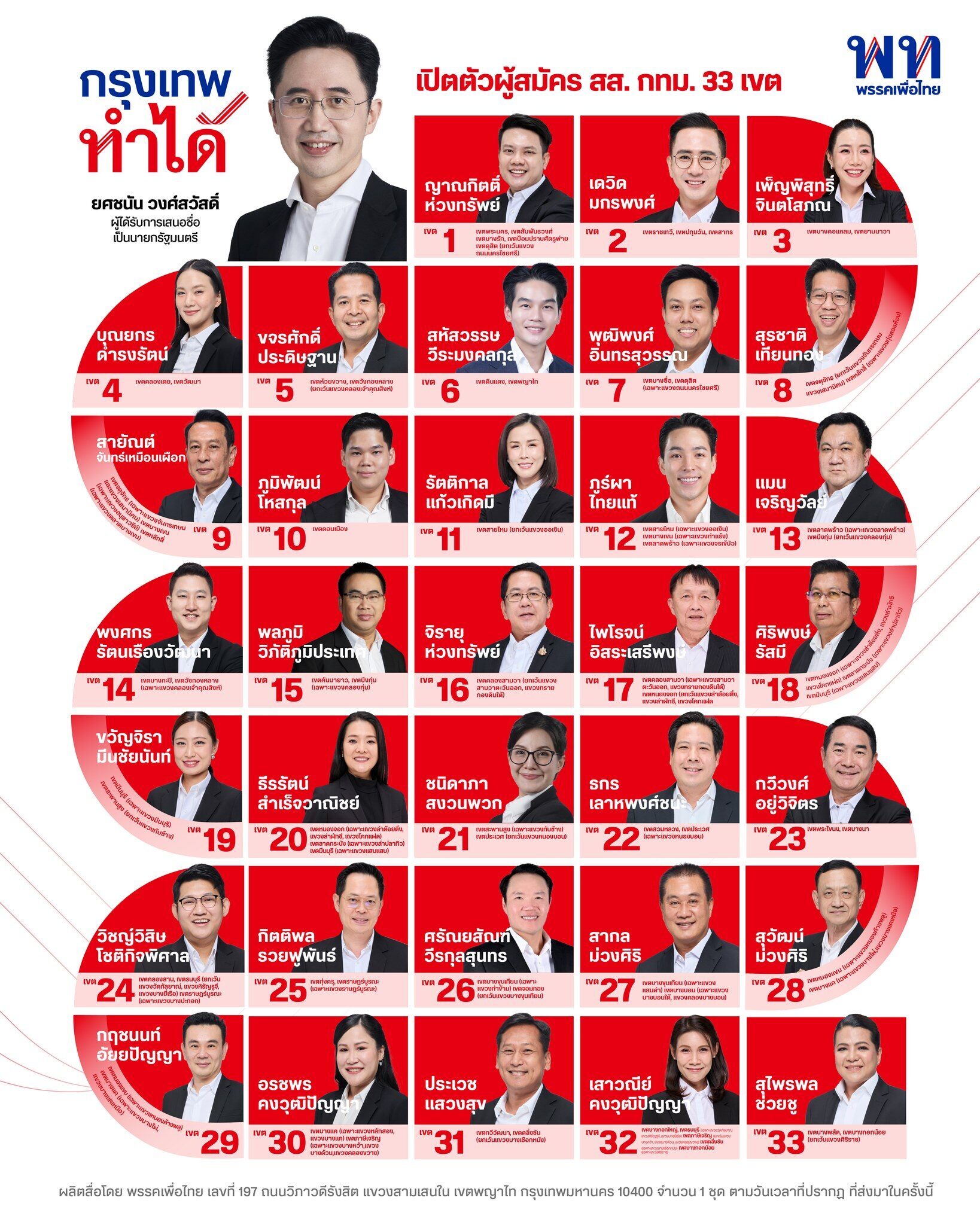 เพื่อไทย เปิดรายชื่อ 33 ผู้สมัคร สส.กทม. เผยโฉมกลุ่มหน้าใหม่ อดีต สส.ทวงแชมป์ ชูสโลแกน “เพื่อไทยทำได้ ทำให้ไทยยิ่งใหญ่ เลือกพรรคเพื่อไทย ทั้งคนทั้งพรรค”