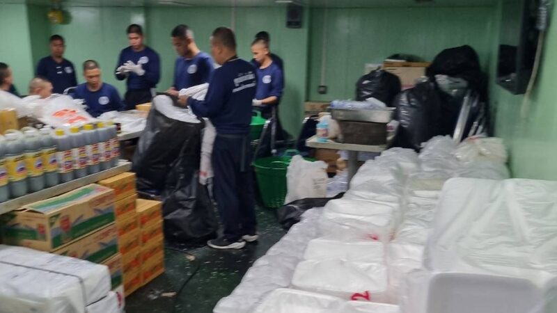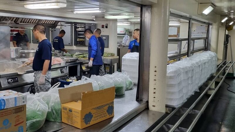 กำลังพลประจำโรงครัวได้จัดเตรียมอาหารปรุงสุกและน้ำดื่ม จำนวน 3,000 ชุด เพื่อส่งมอบให้ประชาชนในพื้นที่ประสบภัยในหลายจุดที่การสัญจรทางบกยังเข้าถึงได้ยาก โดยได้จัดอากาศยานเฮลิคอปเตอร์ของกองทัพเรือทำการลำเลียงสิ่งของบรรเทาทุกข์ดังกล่าวขึ้นบินในช่วงเช้าของวันนี้แล้ว
