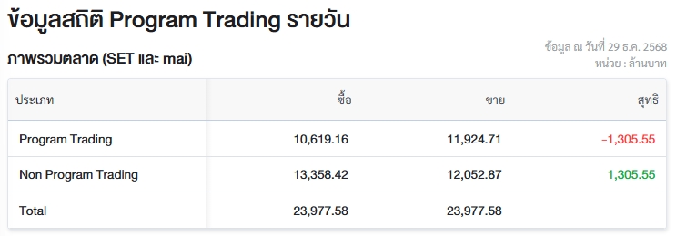 อัพเดต 29 ธ.ค. 2568 เวลา 12.16 น. • เผยแพร่ 29 ธ.ค. 2568 เวลา 12.16 น. • ข่าวหุ้นธุรกิจออนไลน์ผู้สื่อข่าวรายงานว่า วันนี้ (29 ธ.ค.68) ตลาดหลักทรัพย์แห่งประเทศไทย (ตลท.) เปิดเผยข้อมูลซื้อขายรายวันผ่าน Program Trading หรือ “โปรแกรมโรบอทเทรดดิ้ง” พบว่ามีมูลค่าซื้อจำนวน 10,619.16 ล้านบาท และมูลค่าขายจำนวน 11,924.71 ล้านบาท เท่ากับขายสุทธิ 1,305.55 ล้านบาท