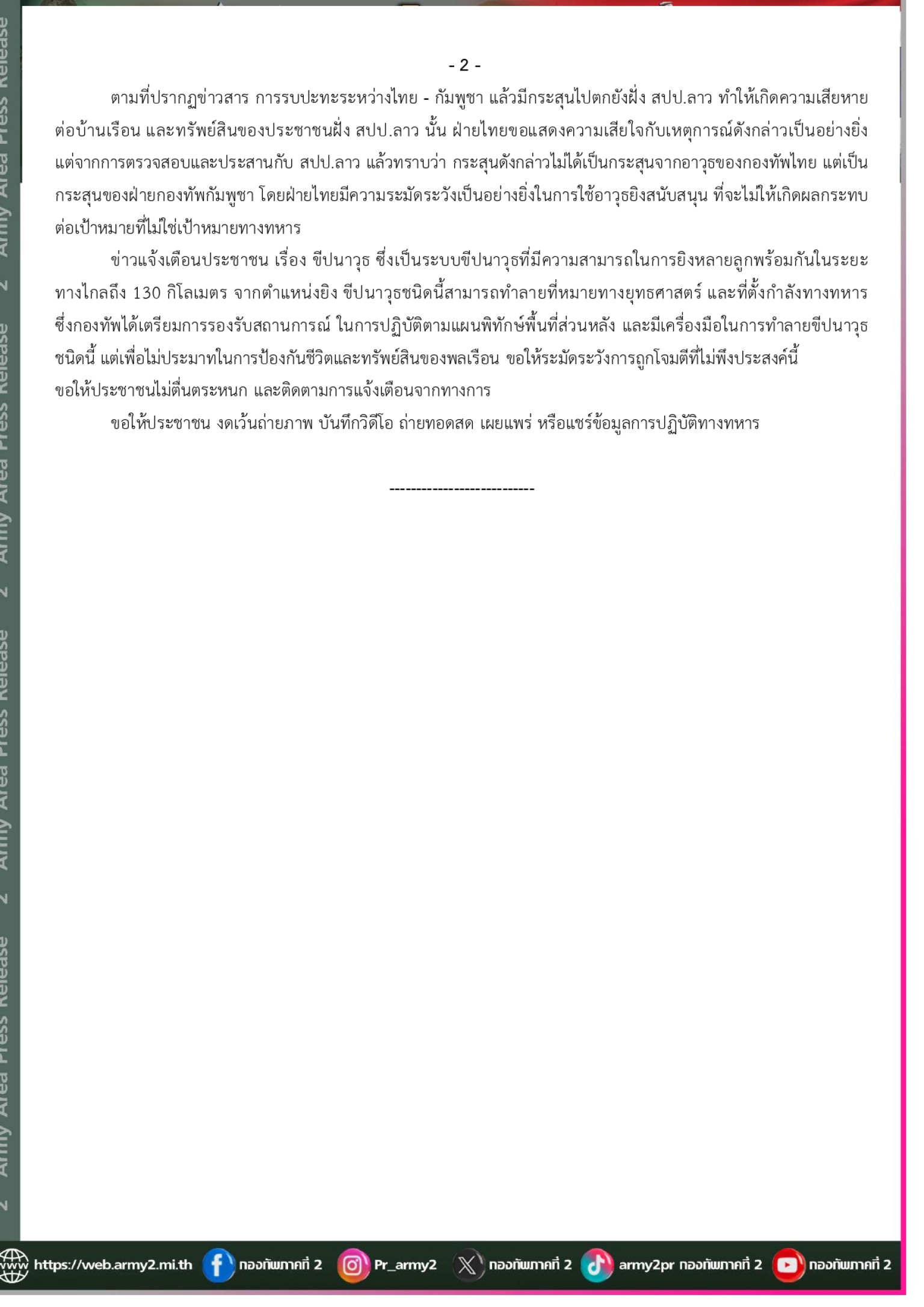 "กองทัพภาคที่ 2" สรุปสถานการณ์การสู้รบตามแนวชายแดนไทย-กัมพูชา ประจำวันที่ 26 กรกฎาคม 2568