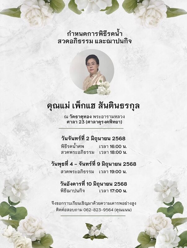 หลังจากที่นักแสดงหนุ่ม นนกุล ชานน สันตินธรกุล ได้ออกมาแจ้งข่าวเศร้า จากการสูญเสียครั้งยิ่งใหญ่ คุณแม่เพ็กแฮ สันตินธรกุล ท่ามกลางความเสียใจของคนในครอบครัว
