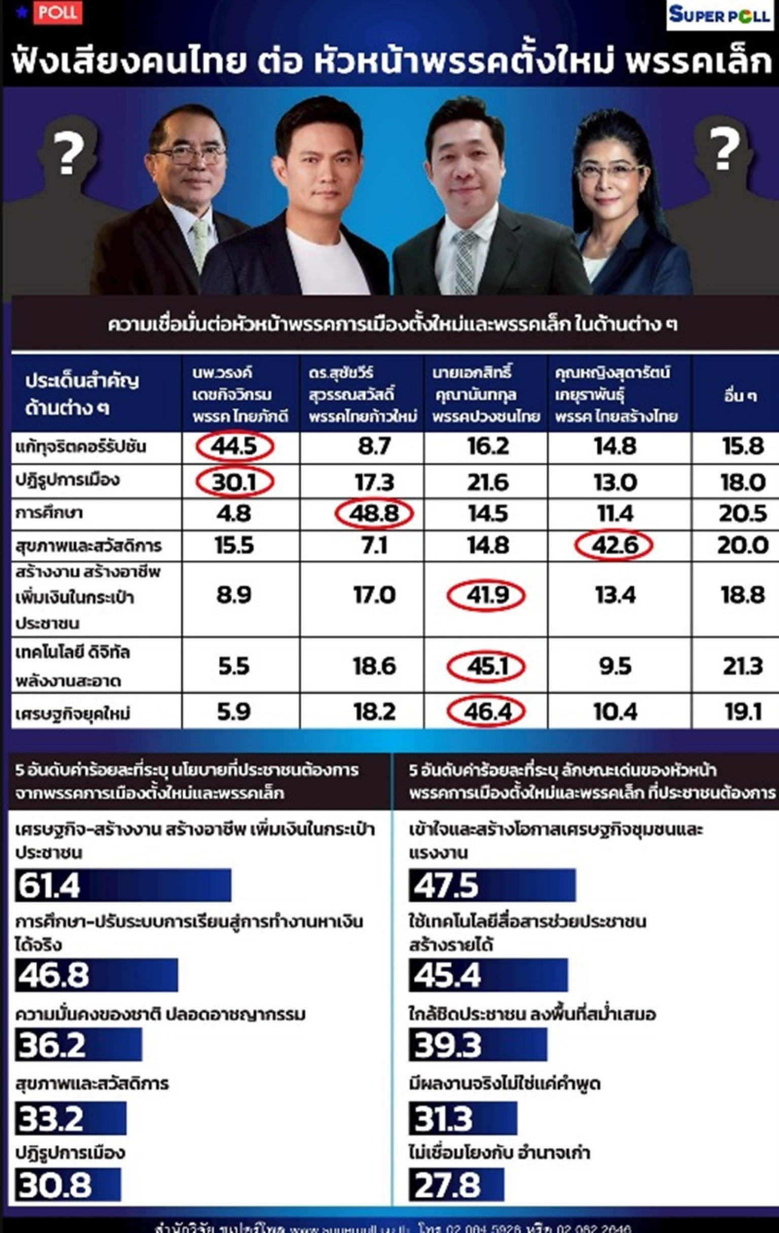 ที่น่าสนใจคือ ศักยภาพของหัวหน้าพรรคการเมืองตั้งใหม่และพรรคเล็ก สะท้อนความเชื่อมั่นเฉพาะทางที่แตกต่างอย่างมีพลัง ซึ่งเป็นหนึ่งในประเด็นสำคัญที่ปรากฏชัดจากการสำรวจโดยสำนักวิจัยซูเปอร์โพลนี้ คือ ความเชื่อมั่นของประชาชนต่อหัวหน้าพรรคการเมืองตั้งใหม่และพรรคเล็กในประเด็นเฉพาะทาง ซึ่งเผยให้เห็นว่า ผู้นำแต่ละคนมีภาพลักษณ์และจุดแข็งที่แตกต่างกันอย่างชัดเจน ทั้งในเชิงนโยบาย ความสามารถ และการยอมรับจากประชาชนในวงกว้าง