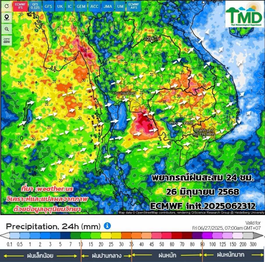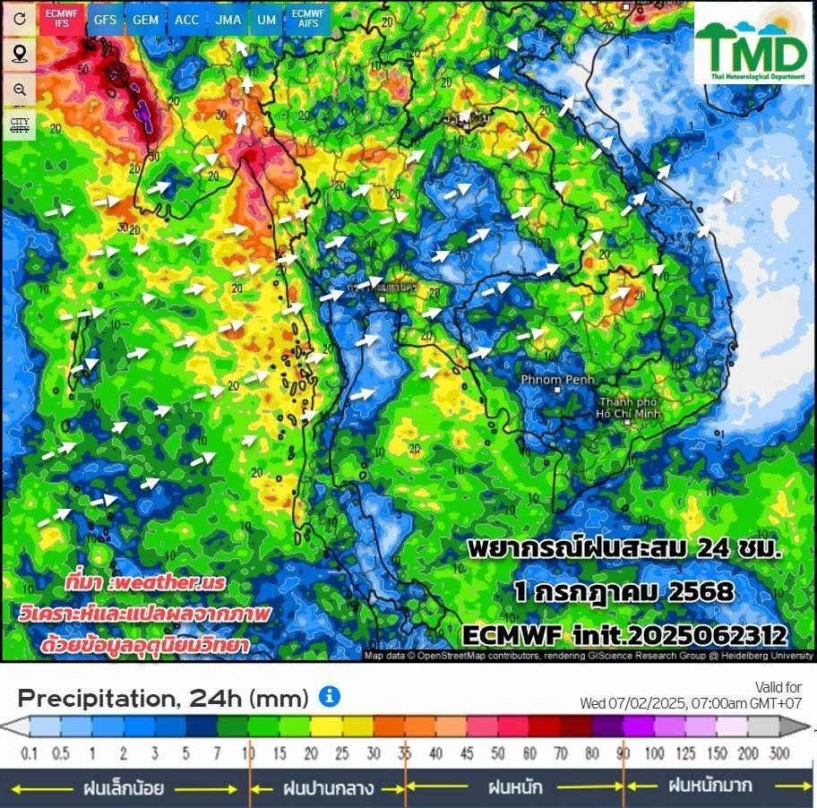 วันที่ 24 มิ.ย.2568 กรมอุตุนิยมวิทยา อัพเดตผลการพยากรณ์ฝนสะสมรายวัน (ทุกๆ 24 ชม.:(นับตั้งแต่ 07.00น. ถึง 07.00น.วันรุ่งขึ้น) และลมที่ระดับ 925hPa (750 ม.)14 วันล่วงหน้า ระหว่าง 24 มิ.ย.-7 ก.ค.68 init. 2025062312 จากศูนย์พยากรณ์อากาศระยะกลางยุโรป (ECMWF)