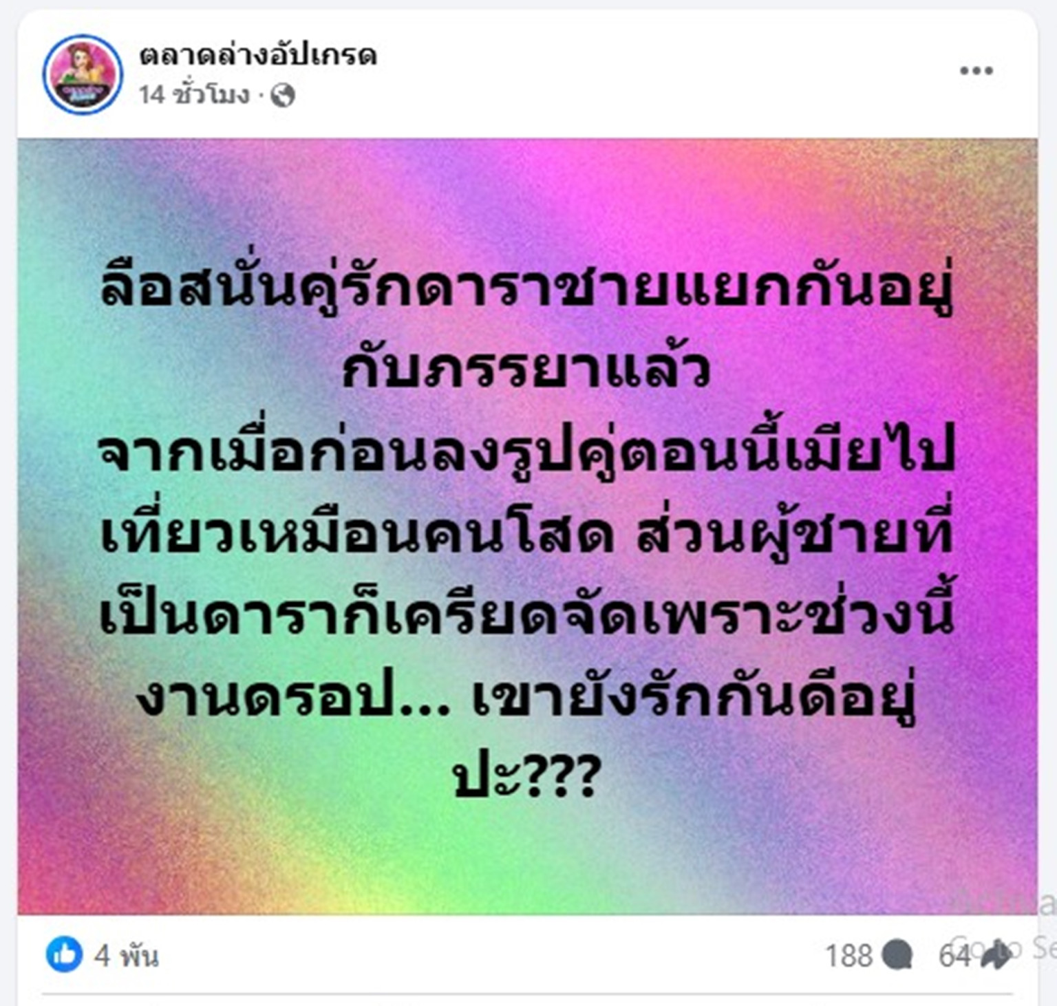 เมื่อวันที่ 8 ก.ค.68 เพจเฟซบุ๊ก "ตลาดล่างอัปเกรด" โพสต์ข้อความระบุว่า "ลือสนั่นคู่รักดาราชายแยกกันอยู่กับภรรยาแล้ว จากเมื่อก่อนลงรูปคู่ตอนนี้เมียไปเที่ยวเหมือนคนโสด ส่วนผู้ชายที่เป็นดาราก็เครียดจัดเพราะช่วงนี้งานดรอป… เขายังรักกันดีอยู่ปะ???"