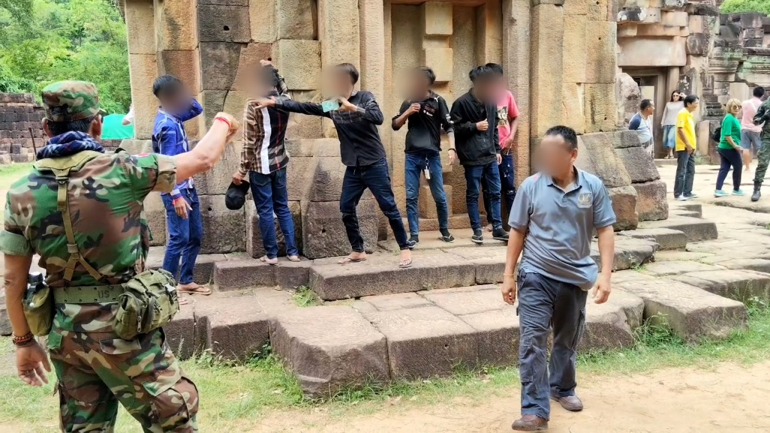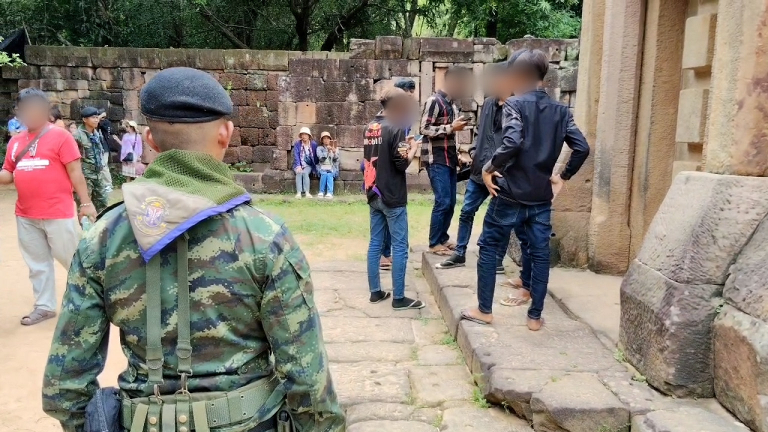 ขณะที่ทหารกัมพูชาได้เข้ามาปรามวัยรุ่นกัมพูชา ว่าให้มาเที่ยวปกติ อย่ามาก่อกวน เกรงจะมีปัญหา เนื่องจากพบกลุ่มวัยรุ่นชาวไทย เริ่มเข้ามาและสังเกตุการณ์ จากนั้นไม่นานพบวัยรุ่นกัมพูชาอีกกลุ่ม เดินมาบอกทหารกัมพูชา ว่าถูกวันรุ่นไทยใช้แขนคล้องคอกระชากคอตกลงมาจากตัวปราสาท ก่อนที่ทหารกัมพูชาจะบอก ทหารไทย ซึ่งทหารไทยก็รับปากว่าจะให้แต่ละฝ่ายดูแลความเรียบร้อยคนของตัวเอง ก่อนที่ทหารไทยจะเดินไปบอกและปรามกลุ่มวัยรุ่นไทยว่าอย่าไปหาเรื่องทะเลาะวิวาทย์กับวัยรุ่นกัมพูชา เพราะ จนท.จะทำงานลำบาก