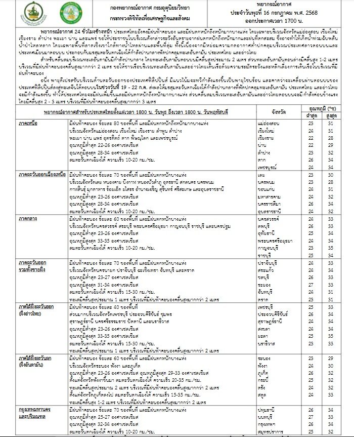 วันที่ 16 ก.ค.2568 กรมอุตุนิยมวิทยา พยากรณ์อากาศ 24 ชั่วโมงข้างหน้า ประเทศไทยยังคงมีฝนฟ้าคะนอง และมีฝนตกหนักถึงหนักมากบางแห่ง โดยเฉพาะบริเวณ จังหวัดแม่ฮ่องสอน เชียงใหม่ เชียงราย ลำปาง พะเยา น่าน และแพร่ ขอให้ประชาชนในบริเวณดังกล่าวระวังอันตรายจากฝนตกหนักถึงหนักมากและฝนที่ตกสะสม ซึ่งอาจทำให้เกิดน้ำท่วมฉับพลัน น้ำป่าไหลหลาก