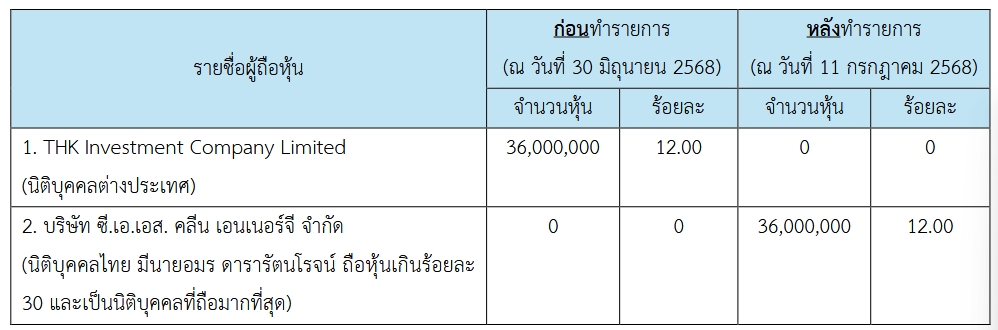 TNR แจ้ง THK ขายบิ๊กล็อต 36 ล้านหุ้น ให้ “ซี.เอ.เอส. คลีนฯ” ขึ้นแท่นถือ 12%