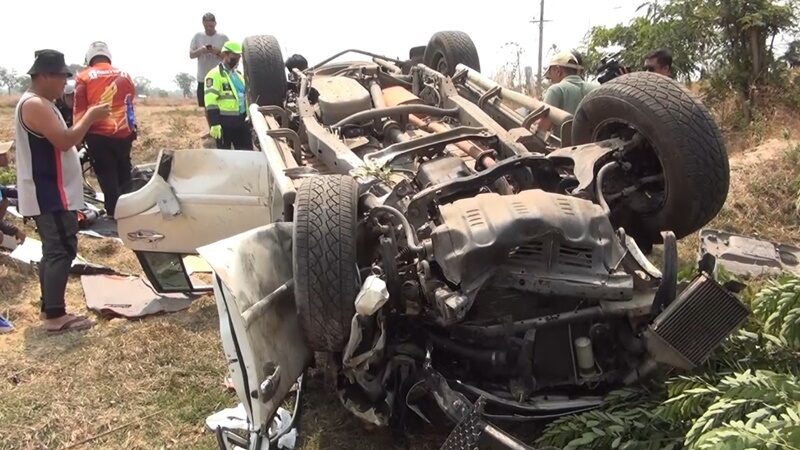 4 ชีวิตหวิดดับหมู่! แซงหกล้อท้ายรถสะบัด พุ่งอัดเสาไฟกระเด็นตกนาหงายท้อง