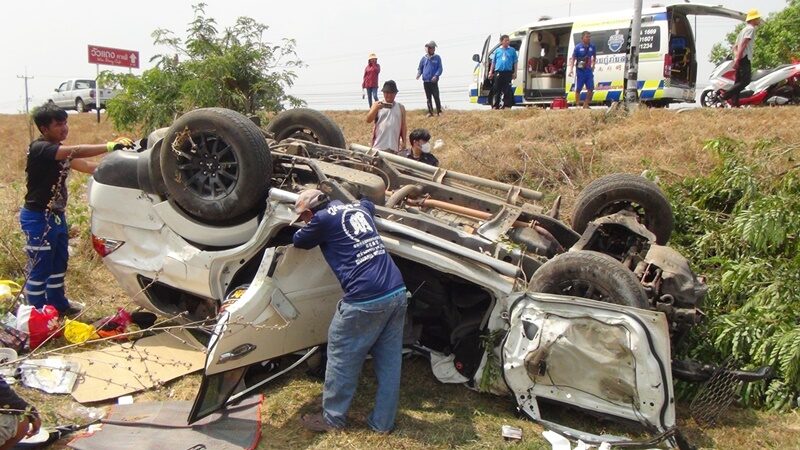 หวิดดับหมู่ 2 ฝรั่ง 2 สาวไทย กลับจากเที่ยวโบราณสถาน เร่งแซงหกล้อท้ายสะบัดบังคับรถไม่ได้ เสียหลักพุ่งชนเสาไฟฟ้า กระเด็นตกข้างทางพลิกหงายท้องล้อชี้ฟ้าบาดเจ็บทั้งคัน