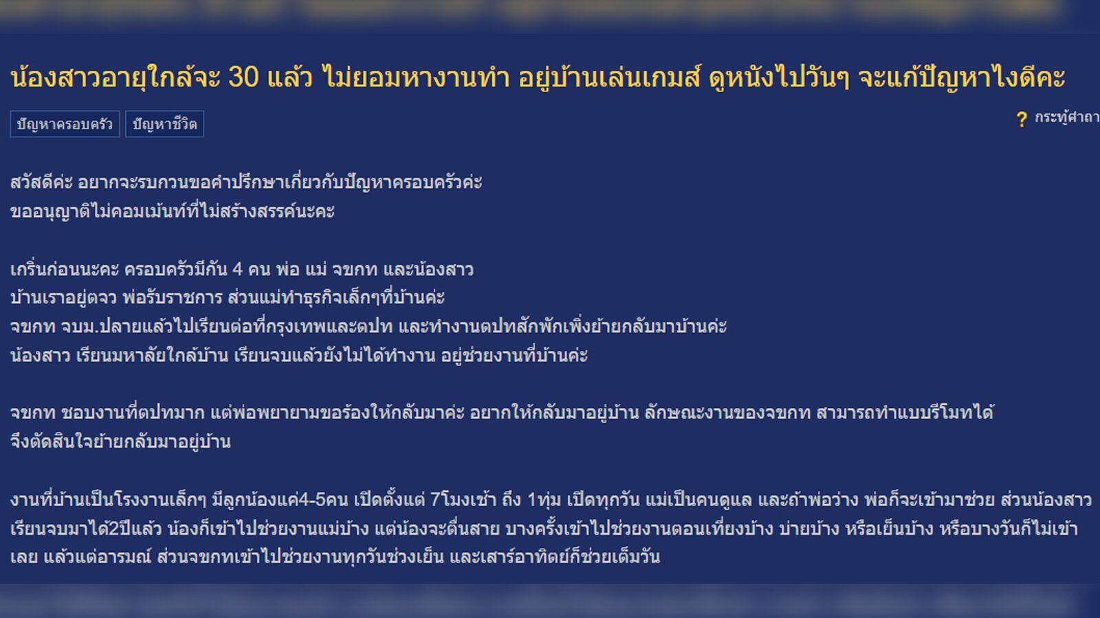 อ่านข่าวต้นฉบับได้ที่ : สุดเครียด น้องสาวอายุจะ 30 ไม่หางานทำ-เล่นเกมไปวันๆ เก็บตัวอยู่แต่ในห้อง แก้ไงดี