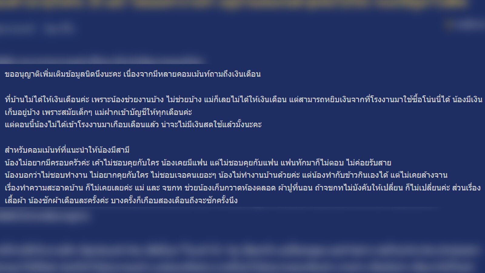 เมื่อวันที่ 18 กันยายน 2567 สมาชิกรายหนึ่งได้ตั้งกระทู้ปรึกษาปัญหาครอบครัว เมื่อน้องสาวของเธอเอาแต่เก็บตัวเงียบ ไม่ยอมทำงาน ไม่ยอมทำความสะอาดบ้าน และไม่ยอมพบเจอใครเลย แม้แต่พ่อแม่ก็ยังห้ามไม่อยู่!