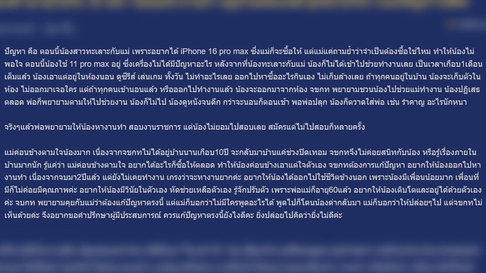 ปัญหาคือช่วงนี้น้องทะเลาะกับแม่ เพราะน้องอยากได้ iPhone 16 pro max ซึ่งแม่จะตั้งใจซื้อให้อยู่แล้ว เพียงแค่ถามย้ำถึงจำเป็นเฉย ๆ แต่กลับสร้างความไม่พอใจให้กับน้อง จนไม่ยอมเข้าไปช่วยทำงานที่โรงงานเลย