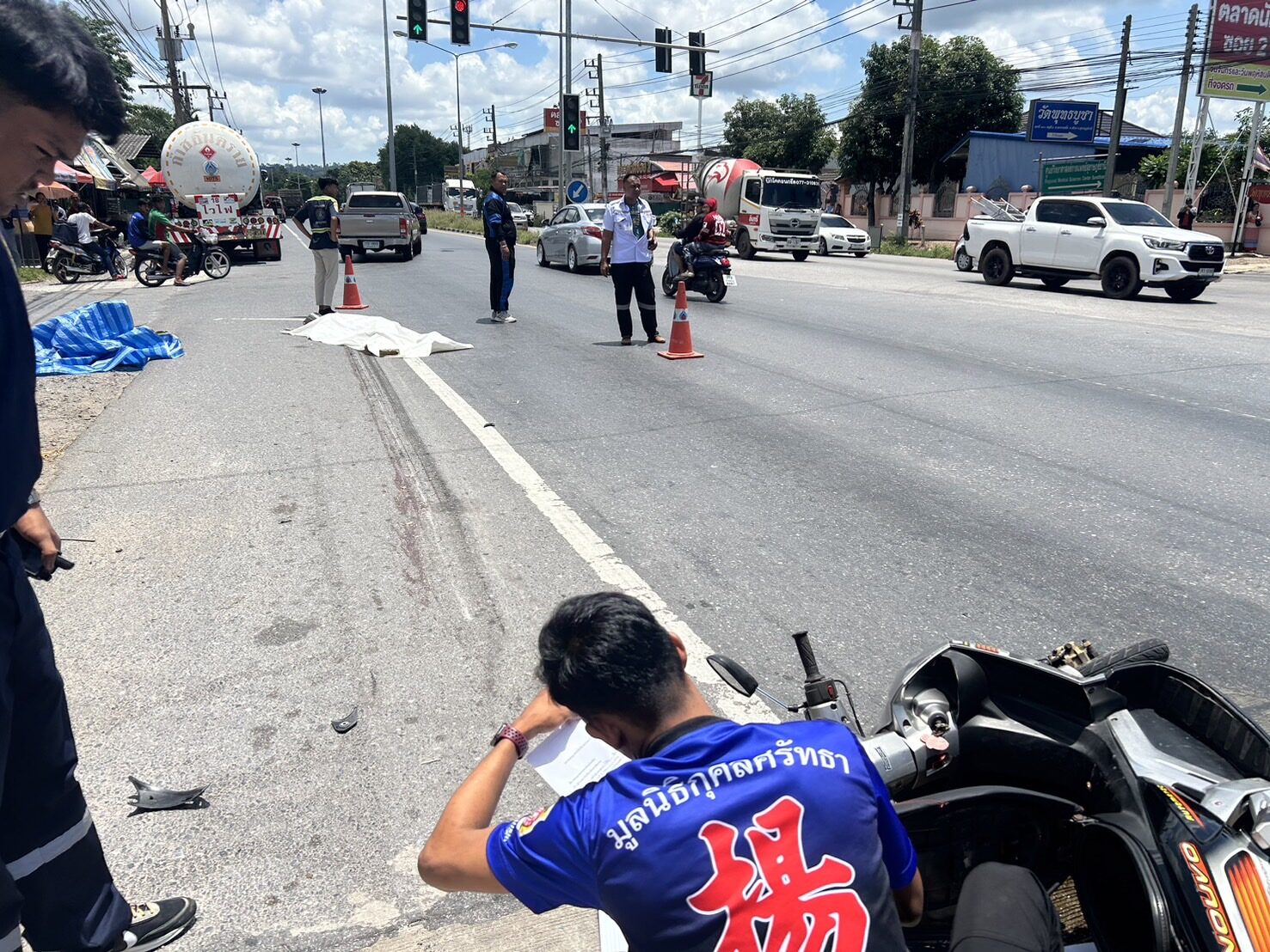 ที่เกิดเหตุพบรถจักรยานยนต์ ล้มตะแคงอยู่ได้รับความเสียหาย ใกล้กันพบร่างผู้เสียชีวิตทราบชื่อต่อมา น.ส.เอ อายุ 16 ปี ชาว อ.กาญจนดิษฐ์ จ.สุราษฎร์ธานี สภาพศพสวมชุดนักเรียน ใกล้กันพบกระเป๋านักเรียน ภายในกระเป๋าพบใบขออนุญาตออกนอกโรงเรียนในเวลาเรียน (แบบไม่กลับมาอีก) ลงวันที่ 19 ส.ค. ห่างไปประมาณ 20 เมตร พบรถสิบล้อยี่ห้อฮีโน่ สีขาว บรรทุกน้ำมันจอดอยู่และคนขับรอให้การ