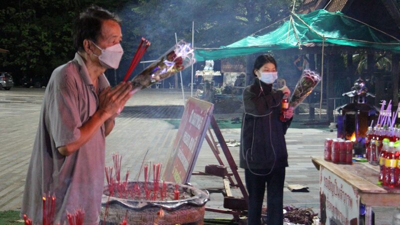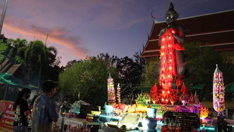 สำหรับบรรยากาศยามค่ำคืนมีชาวบ้านเดินทางกันมาขอโชคลาภอย่างคึกคัก สังเกตจากพวงมาลัยสีแดง ดอกกุหลาบสีแดง และน้ำแดงที่มีการนำมาถวายจำนวนมาก ซึ่งทางวัดได้จัดเก้าอี้บริเวณลานวัด เว้นระยะห่างให้นั่งขอพรกันเพื่อความปลอดภัยจากโควิด 19 อากาศถ่ายเทสะดวกสบาย โดยจะมีพระลูกวัดเป็นโฆษกคอยให้คำแนะนำดูแล พร้อมทั้งแจกหนังสือสวดมนต์เป็นธรรมทานแก่ประชาชนที่เดินทางมาที่วัดเพื่อนำกลับไปสวดมนต์เป็นสิริมงคลแก่ตนเองและครอบครัวด้วย