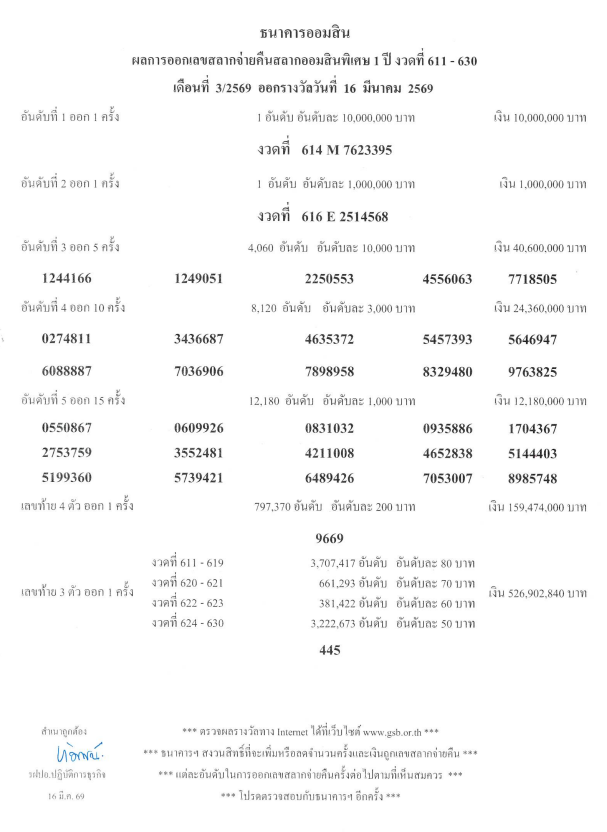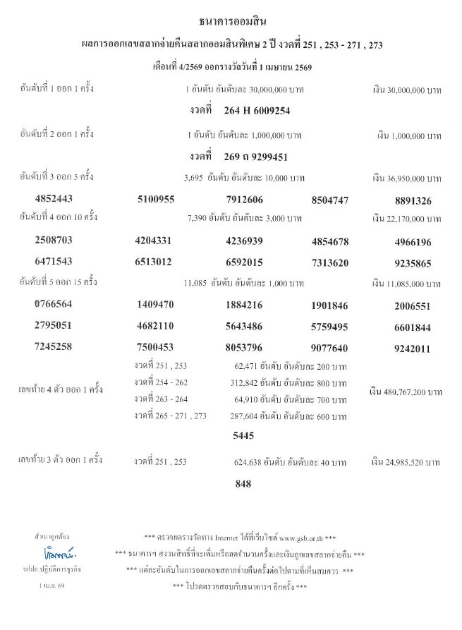วันที่ 1 เม.ย.2569 ธนาคารออมสิน เผยแพร่ ผลการออกสลากจ่ายคืนสลากออมสินพิเศษ 2 ปี งวดที่ 251, 253-271, 273 เดือนที่ 4/2569 ออกรางวัลวันที่ 1 เมษายน 2569
