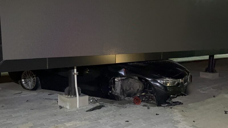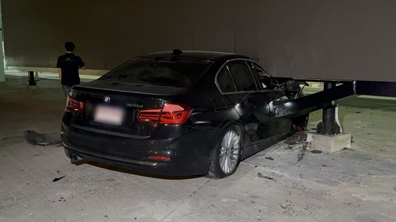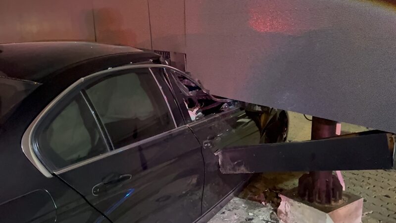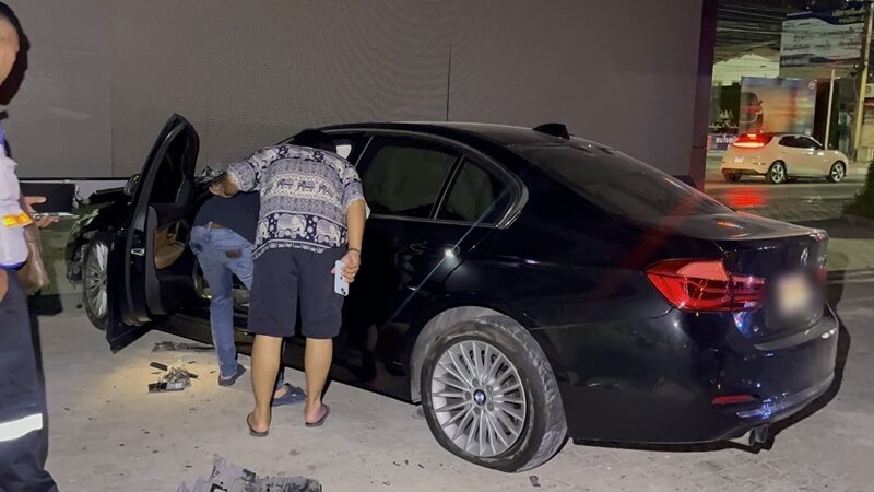 หนุ่มขับ BMW เหินขึ้นเกาะกลางถนน พุ่งชนป้ายโฆษณา พังยับเยิน