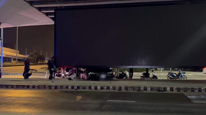 เมื่อเวลา 00.20 น. วันที่ 1 เม.ย.2569 เจ้าหน้าที่ตำรวจ สภ.เมืองพัทยา รับแจ้งเหตุรถเก๋งเสียหลักพุ่งขึ้นเกาะกลางถนนชนป้ายโฆษณา บริเวณทางแยกมอเตอร์เวย์ ทางออกพัทยา ต.หนองปรือ อ.บางละมุง จ.ชลบุรี จึงรุดไปตรวจสอบพร้อมอาสาสมัครกู้ภัยสว่างบริบูรณ์ธรรมสถานเมืองพัทยา