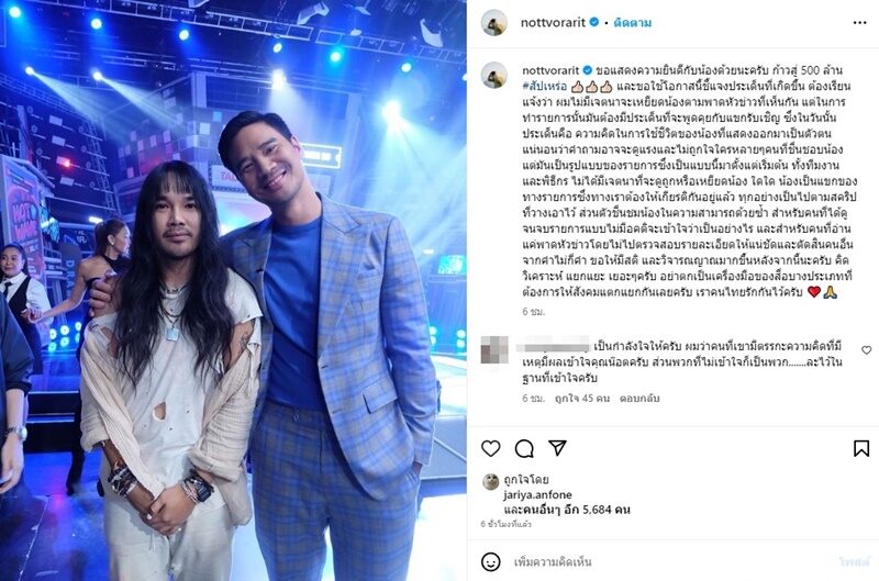 ขณะที่ น็อต วรฤทธิ์ โพสต์ลงโซเชียลหลังเจอ ต้องเต อีกครั้ง พร้อมภาพร่วมเฟรม และแคปชั่นร่วมแสดงความยินดีกับความสำเร็จ และชี้แจงปมดราม่าต่างๆนานาว่า