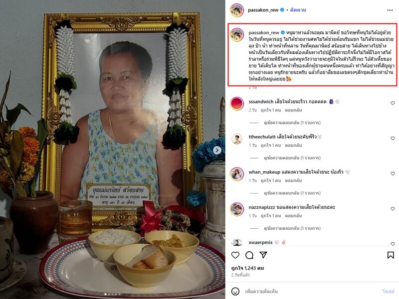 ล่าสุด ริว ภาสกร โพสต์อาลัยสูญเสียคุณยายสุดเศร้าที่ไม่สามารถอยู่ในช่วงเวลาสำคัญนั้นได้ ล่าสุดกลับมาหาคุณยายแล้วว่า