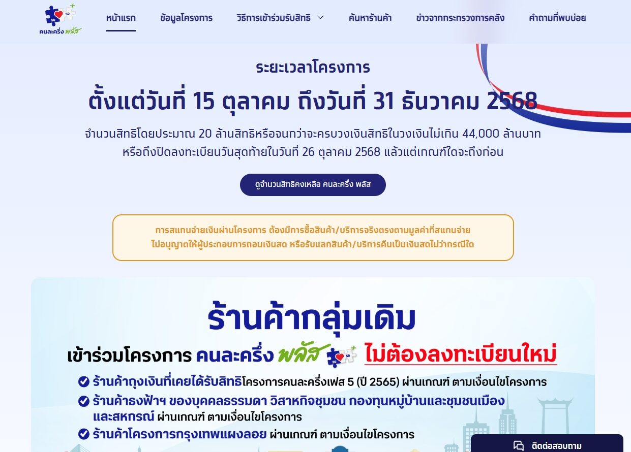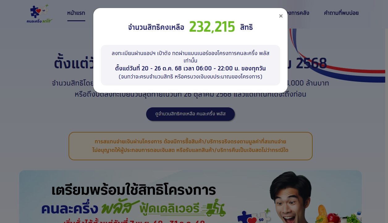 ดูจำนวนสิทธิคงเหลือ คนละครึ่งพลัส ตรวจสอบสิทธิล่าสุดยังมีอยู่กว่า 2 แสนสิทธิ ใครยังไม่ลงทะเบียนรีบเลย ที่เว็บไซต์ www.คนละครึ่งพลัส.com