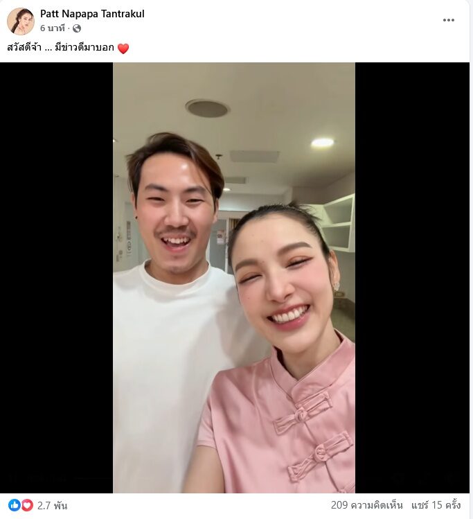 แพท ณปภา โพสต์คลิปข่าวดีรับวันตรุษจีน 17 ก.พ.69 ขณะอยู่กับ พ่อพี สามี ด้วยใบหน้ายิ้มสุดๆ บอกว่าวันนี้ทั้งสองคนมีข่าวดีจะบอก พร้อมแคปชั่นว่า “สวัสดีจ้า … มีข่าวดีมาบอก”