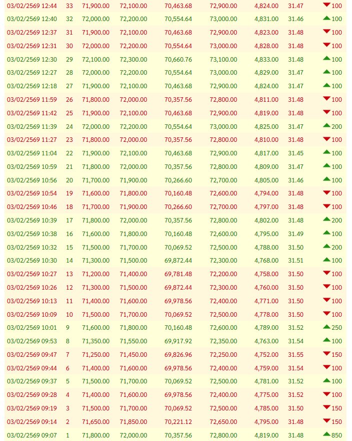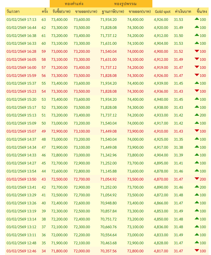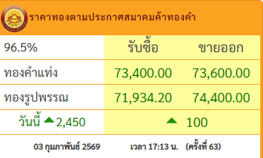 ราคาทองวันนี้ (3 ก.พ. 69) ปรับขึ้น 2,450 บาท รูปพรรณขายออก 74,400 บาท ทองคำแท่งรับซื้อบาทละ 73,400.00 บาท ขายออกบาทละ 73,600.00 บาท