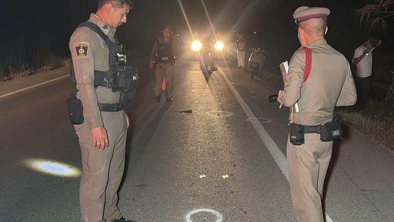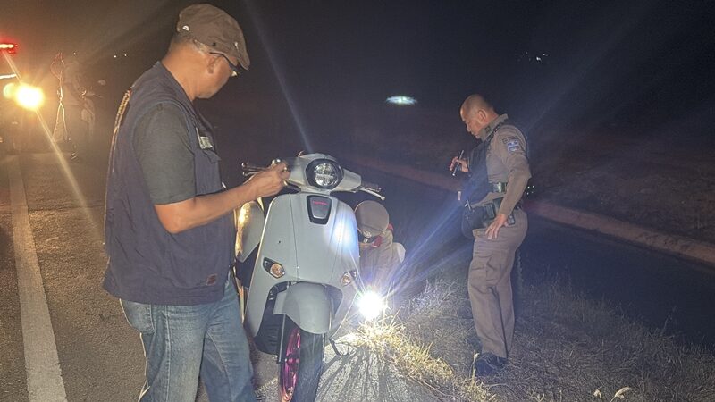 เจ้าหน้าที่ตำรวจตรวจสอบรถจักรยานยนต์ของผู้เสียชีวิต
