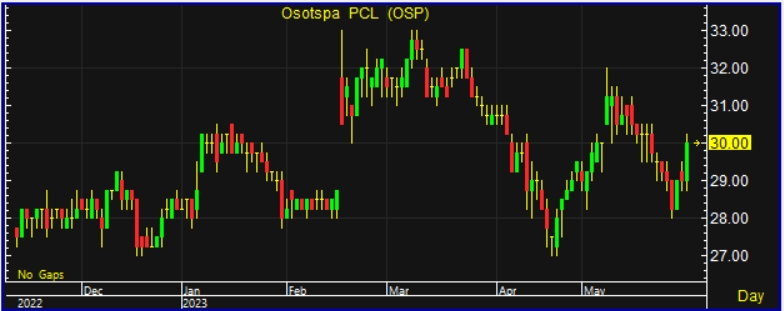 ผู้สื่อข่าวรายงานว่า วันนี้ (2 มิ.ย.66) ราคาหุ้นบริษัท โอสถสภา จำกัด (มหาชน) หรือ OSP ณ เวลา 15.16 น. อยู่ที่ระดับ 30.00 บาท บวก 1.00 บาท หรือ 3.45% สูงสุดที่ระดับ 30.25 บาท ต่ำสุดที่ระดับ 28.75 บาท ด้วยมูลค่าการซื้อขาย 343.99 ล้านบาท