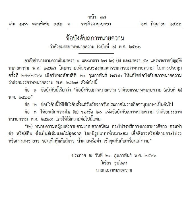 เมื่อวันที่ 28 มิ.ย.66 ผู้สื่อข่าวรายงานว่า เว็บไซต์ราชกิจจานุเบกษาก็เผยแพร่ ข้อบังคับสภาทนายความ ว่าด้วยมรรยาททนายความ (ฉบับที่ 2) พ.ศ.2566 ที่ให้ ทนายความหญิงใส่กางเกงว่าความได้แล้ว มีผลตั้งแต่ 28 มิถุนายน 2566 เป็นต้นไป