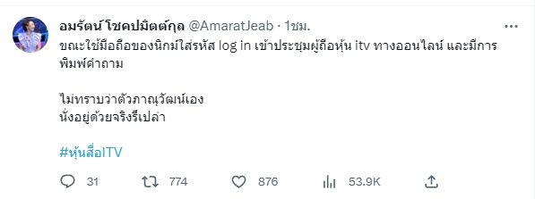 อมรัตน์ ถาม ‘ภาณุวัฒน์’ เข้าประชุมหุ้น ITV จากมือถือ 'นิกม์' ตอนพิมพ์ถามนั่งอยู่ด้วยจริงมั้ย