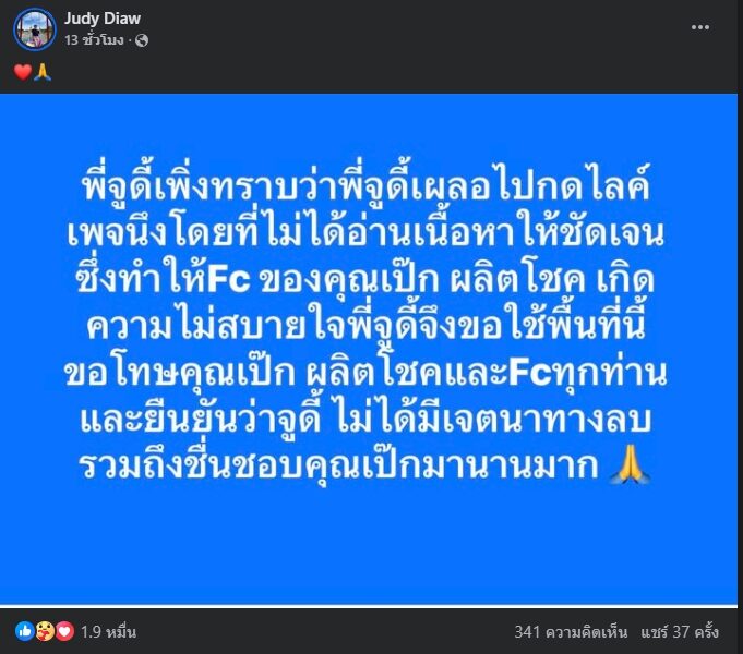 พี่จูดี้จึงขอใช้พื้นที่นี้ ขอโทษคุณเป๊ก ผลิตโชค และ FC ทุกท่าน และยืนยันว่าจูดี้ ไม่ได้มีเจตนาทางลบ รวมถึงชื่นชอบคุณเป๊กมานานมาก"