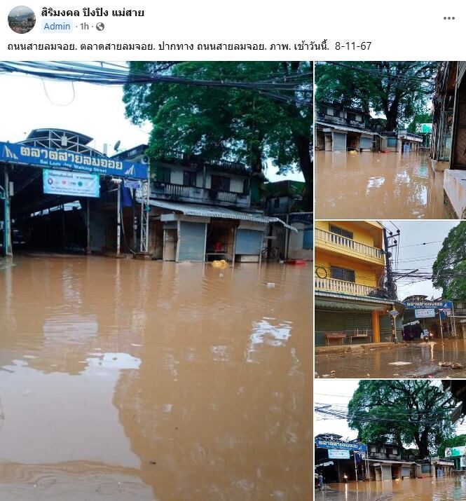วันที่ 8 พ.ย.2567 ผู้สื่อข่าวรายงานว่า หลังเกิดฝนตกลงมาอย่างหนักในพื้นที่ อ.แม่สาย จ.เชียงราย ส่งผลให้เช้าวันนี้มีน้ำท่วมขังในพื้นที่ โดยผู้ใช้เฟซบุ๊ก สิริมงคล ปิงปิง แม่สาย โพสต์ภาพพร้อมข้อความลงในกลุ่มแม่สาย@ที่นี่สายลมจอย เป็นสภาพน้ำท่วมขังในพื้นที่ตลาดสายลมจอย