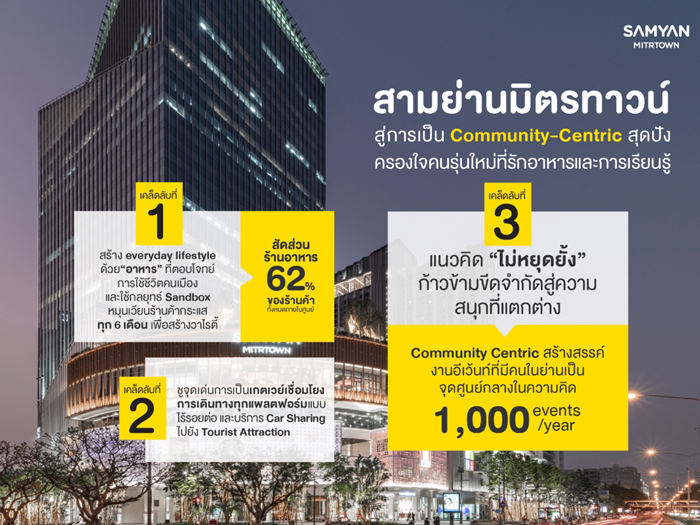 นอกจากนี้ สามย่านมิตรทาวน์ ยังเป็นหนึ่งในใจของลูกค้าเหล่าแบรนด์ดังระดับประเทศ และระดับโลกที่ต้องการเคมีเดียวกัน ไม่ว่าจะเป็นร้านอาหาร แบรนด์ไลฟ์สไตล์ ที่ต่างแวะเวียนกันมาสร้างประสบการณ์ร่วมกัน รวมไปถึงการเปิดตัวคอลเลกชันพิเศษ คอลเลกชันใหม่ พรีเซ็นต์เตอร์สินค้า อีกด้วย ซึ่งในปีนี้สามย่านมิตรทาวน์ได้จัดงานอีเวนต์และคอมมูนิตี้ไปแล้วกว่า 1,000 งาน ครอบคลุมหลากหลายอุตสาหกรรมทั้งจากภาครัฐ ภาคเอกชน และความบันเทิง