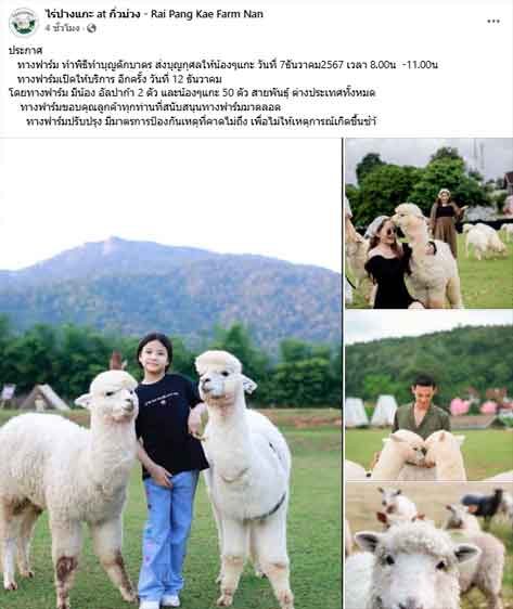 ทางฟาร์มเปิดให้บริการอีกครั้ง วันที่ 12 ธันวาคม โดยทางฟาร์ม มีน้องอัลปาก้า 2 ตัว และน้องๆ แกะ 50 ตัว สายพันธุ์ต่างประเทศทั้งหมด ทางฟาร์มขอบคุณลูกค้าทุกท่านที่สนับสนุนทางฟาร์มมาตลอด ทางฟาร์มปรับปรุงมีมาตรการป้องกันเหตุที่คาดไม่ถึง เพื่อไม่ให้เหตุการณ์เกิดขึ้นซ้ำ